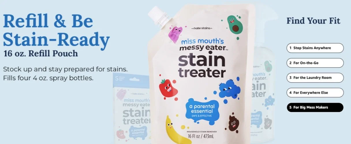 The final piece was to bring the sale home with content for Miss Mouth’s Messy Eater product detail page. This included catchy use cases that nestle each product variation into the customer’s daily life, as well as focused reasons to buy that set the brand apart as a smarter, safer alternative to mainstream stain treaters.